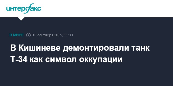 Кишинев. 16 сентября. ИНТЕРФАКС - В Кишиневе на территории мотопехотной бригады имени Штефана Чел Маре в среду сняли с постамента советский танк Т-34. Его намерены передать в "Музей советской оккупации".