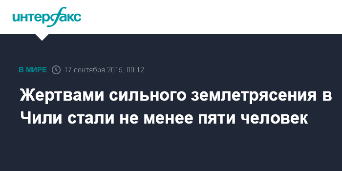 Москва. 17 сентября. INTERFAX.RU – Не менее пяти человек погибли, еще один числится пропавшим без вести в результате землетрясения в Чили, сообщил в ночь на четверг заместитель министра внутренних дел Чили Махмуд Алеуй.