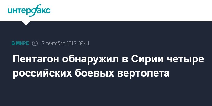 Москва. 17 сентября. INTERFAX.RU - Американские разведывательные спутники зафиксировали появление четырех российских боевых вертолетов в аэропорту сирийского города Латакия, где, как считает Пентагон, российские военные специалисты продолжают создание авиабазы. Об этом в четверг сообщил телеканал Fox News со ссылкой на данные Пентагона.