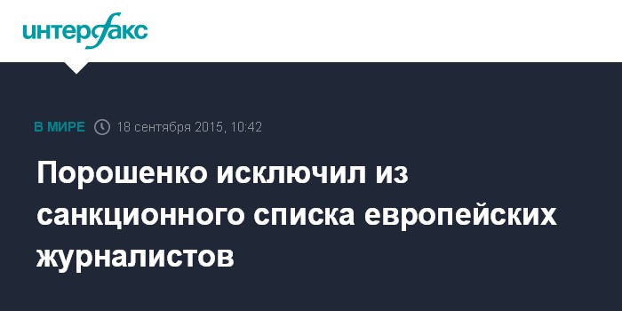 Москва. 18 сентября. INTERFAX.RU - Президент Украины Петр Порошенко своим указом ввел в действие решение Совета национальной безопасности и обороны Украины от 17 сентября, согласно которому из украинского санкционного списка исключены европейские журналисты.