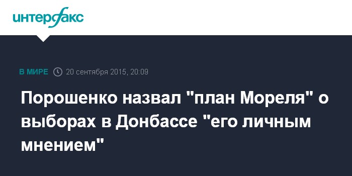 Москва. 20 сентября. INTERFAX.RU - Президент Украины Петр Порошенко сообщил, что расценивает план координатора рабочей группы по политическим вопросам трехсторонней рабочей группы Пьера Мореля по проведению выборов на Донбассе, как личное мнение его автора.