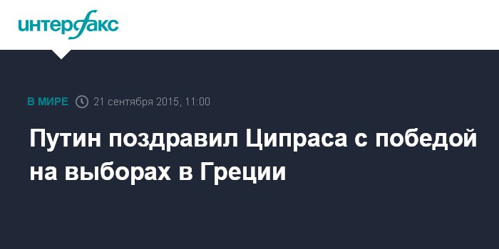 Москва. 21 сентября. INTERFAX.RU - Президент Российской Федерации Владимир Путин направил поздравительную телеграмму Алексису Ципрасу по случаю победы возглавляемой им партии "Коалиция радикальных левых сил" на выборах в парламент Греческой Республики, сообщает пресс-служба Кремля в понедельник.