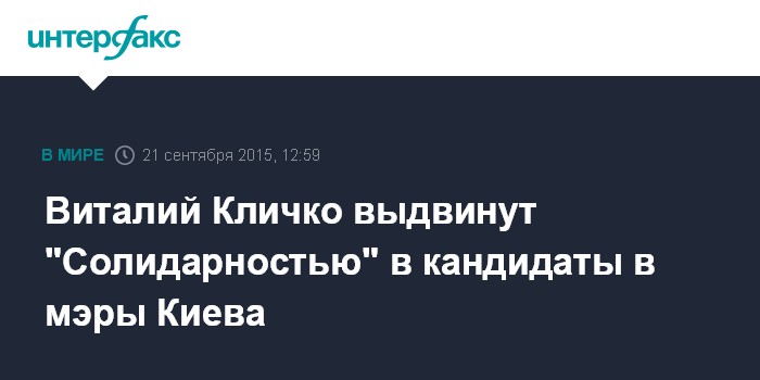 Москва. 21 сентября. INTERFAX.RU - Виталий Кличко выдвинут "Блоком Петра Порошенко "Солидарность" на выборы главы Киева, сообщила в понедельник пресс-секретарь действующего мэра города Оксана Зиновьева в твиттере.