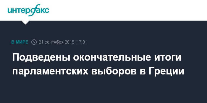 Москва. 21 сентября. INTERFAX.RU - Власти Греции завершили подсчет голосов на досрочных парламентских выборах, по результатам которых коалиция СИРИЗА набрала 35,46% и одержала победу, получив 145 депутатских мандатов, сообщает в понедельник интернет-портал греческой газеты "Катимерини".