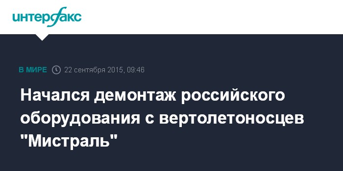 Москва. 22 сентября. INTERFAX.RU - На вертолетоносцах типа "Мистраль" под названиями "Владивосток" и "Севастополь", строившихся во французском Сан-Назере по заказу ВМФ России, начался демонтаж оборудования, сообщает газета "Коммерсант".