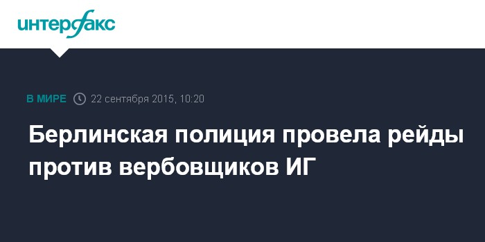 Москва. 22 сентября. INTERFAX.RU - Немецкая полиция провела во вторник утром серию рейдов в Берлине, чтобы разоблачить подозреваемых в вербовке новобранцев в террористическую организацию "Исламское государство" (ИГ, запрещена в России) для участия в боях в Сирии, сообщают местные СМИ со ссылкой на полицию.