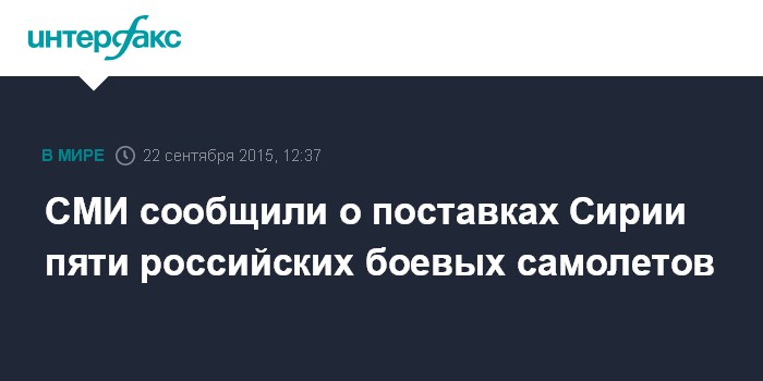 Москва. 22 сентября. INTERFAX.RU - Правительственные войска Сирии за последние дни получили от РФ не менее пяти боевых самолетов, сообщил во вторник французский телеканал "БФМ-ТВ" со ссылкой на сирийский военный источник.