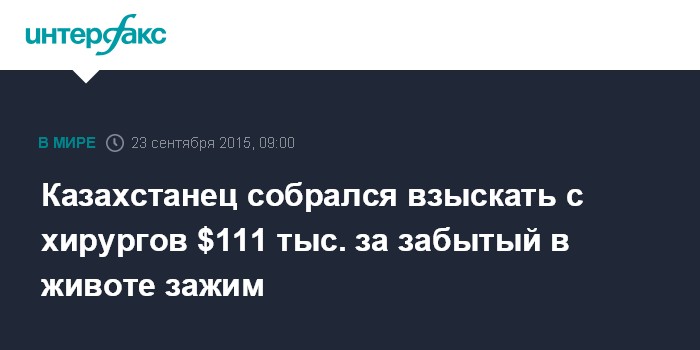 Москва. 23 сентября. INTERFAX.RU – В Казахстане житель города Шахтинска Карагандинской области 73-летний Бектур Токмагамбетов, в животе которого во время операции врачи забыли хирургический инструмент, намерен взыскать с больницы 30 млн тенге (около $111 тыс.).