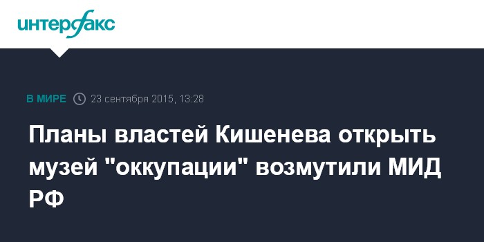 Москва. 23 сентября. INTERFAX.RU - Москва возмущена инициативой министра обороны Молдавии создать музей "советской оккупации", рассматривает демонтаж мемориала танкистам в Бельцам как кощунственный.