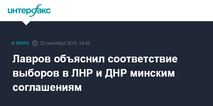 Москва. 23 сентября. INTERFAX.RU - Проведение выборов в самопровозглашенных Донецкой и Луганской народных республиках не противоречит минским договоренностям, так как в них не указано никаких конкретных сроков, заявил глава МИД РФ Сергей Лавров.