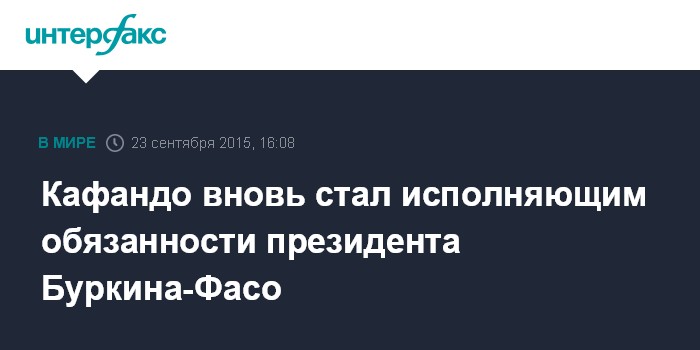 Москва. 23 сентября. INTERFAX.RU - Свергнутый неделю назад с поста исполняющего обязанности президента Буркина-Фасо Мишель Кафандо в среду вновь приступил к работе на посту главы государства, сообщают французские СМИ.