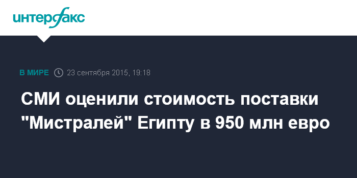 Москва. 23 сентября. INTERFAX.RU - Египет заплатит Франции 950 млн евро за два вертолетоносца типа "Мистраль", которые ранее предназначались для России, сообщило в среду агентство Associated Press со ссылкой на неназванного представителя вооруженных сил Франции.