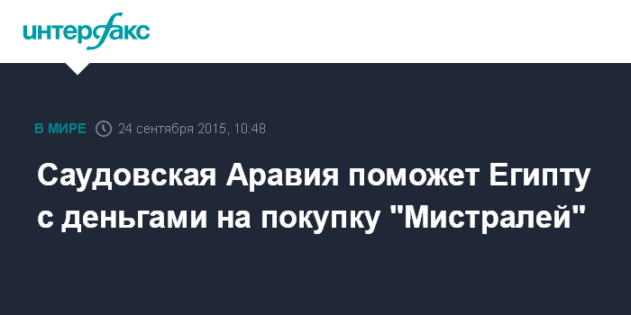 Москва. 24 сентября. INTERFAX.RU - Власти Саудовской Аравии, как ожидается, окажут Египту финансовую помощь, чтобы Каир смог оплатить поставку из Франции двух не переданных России вертолетоносцев "Мистраль", сообщает французское издание L'Express.