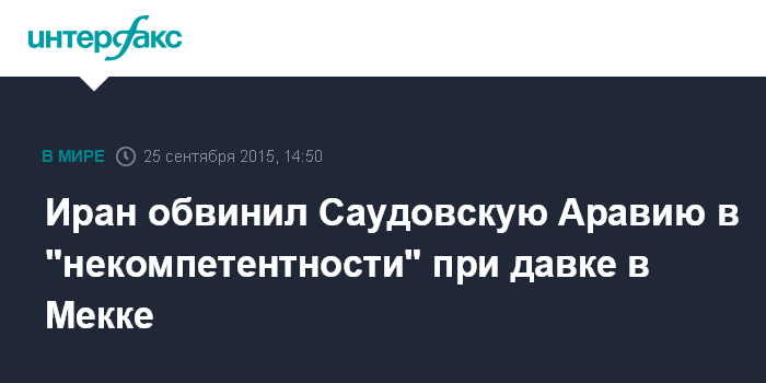 Высший руководитель Ирана аятолла Али Хаменеи заявил в четверг, что неадекватные ситуации действия саудовских властей "привели к катастрофе", и также призвал их взять ответственность на себя. Власти Ирана обвиняют Саудовскую Аравию в дискриминации иранских паломников, которые являются шиитами, утверждает британская газета The Guardian.