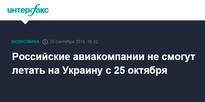 Москва. 25 сентября. INTERFAX.RU – Российским авиакомпаниям, попавшим под украинские санкции, будет запрещено летать на Украину с начала зимней навигации - с 25 октября, говорится в сообщении Государственной авиационной службы Украины.