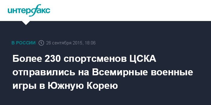 С 2 по 11 октября в Южной Корее пройдут VI Всемирные военные игры (CISM - Conseil International du Sport Militaire). В них примут участие 9 тысяч представителей из 110 стран мира. Представлять Россию на играх будут 232 спортсмена ЦСКА. В программу соревнований включены 24 вида спорта, в 17 из них примут участие армейские атлеты. Основными конкурентами сборной ВС РФ являются военнослужащие из Бразилии и Италии - финалисты предыдущих Всемирных военных игр.