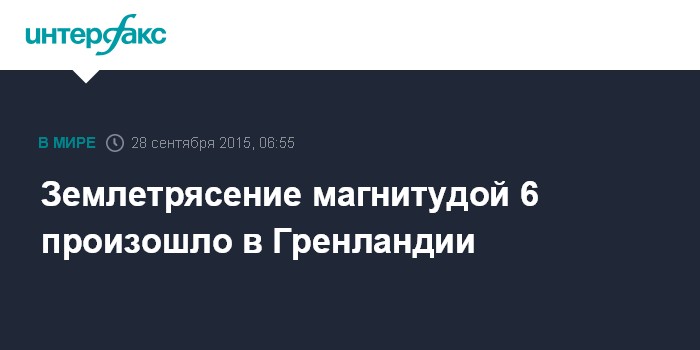 Москва. 28 сентября. INTERFAX.RU - Землетрясение магнитудой шесть зафиксировано в минувшие выходные в южной части Гренландии, сообщает Геофизическая служба ГС Сибирского отделения РАН.