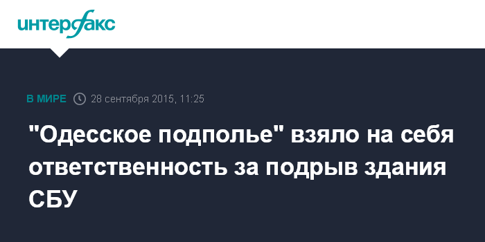 Москва. 28 сентября. INTERFAX.RU - Малоизвестная организация "Одесское подполье" взяла на себя ответственность за взрыв, который произошел около 5 утра в воскресенье у стен здания Одесского управления Службы безопасности Украины.