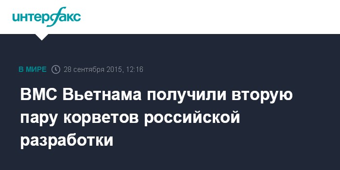 Москва. 28 сентября. INTERFAX.RU - Вторая пара ракетных корветов проекта 1241.8 разработки Центрального морского конструкторского бюро "Алмаз" была передана ВМС Вьетнама, сообщил в понедельник "Интерфаксу" источник в российской кораблестроительной отрасли.