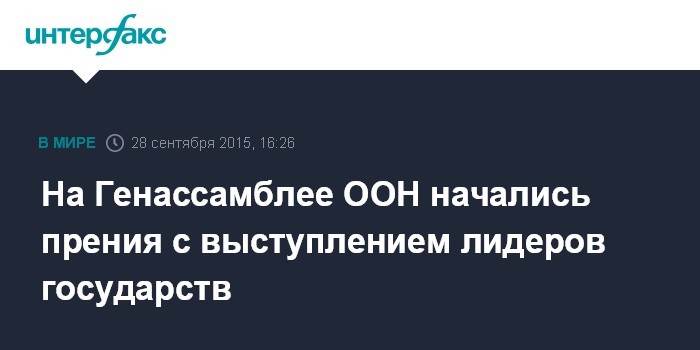 Москва. 28 сентября. INTERFAX.RU - В понедельник на юбилейной 70-й сессии Генеральной Ассамблеи ООН стартовали ежегодные общие прения, которые продлятся по 3 октября.