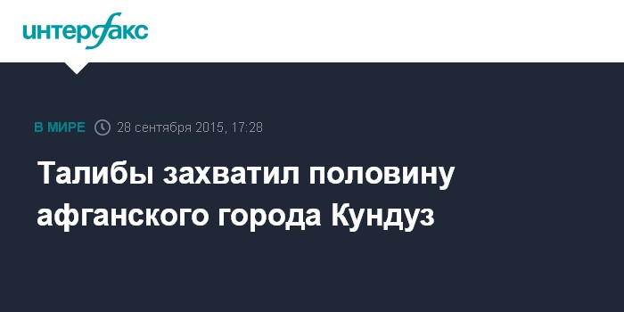 Москва. 28 сентября. INTERFAX.RU - Сотники боевиков движения "Талибан" в понедельник захватили половину стратегического афганского города Кундуз на севере страны, сообщило агентство Associated Press.