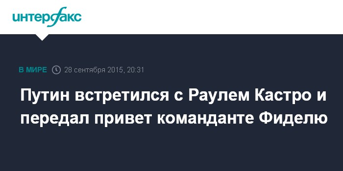 Москва. 28 сентября. INTERFAX.RU - Президент РФ Владимир Путин на встрече с председателем Госсовета Кубы Раулем Кастро передал привет команданте Фиделю Кастро.