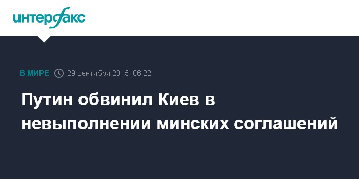 Москва. 29 сентября. INTERFAX.RU - Президент РФ Владимир Путин обвинил власти в Киеве в том, что они не выполняют Минские соглашения, а США в "передергивании" сути этих договоренностей, требующих согласования всех реформ с Донецком и Луганском.