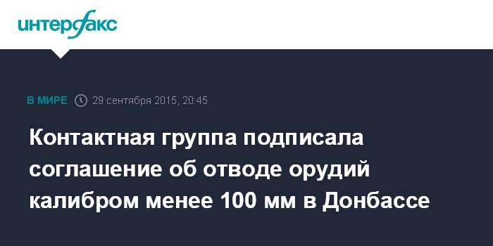 Москва. 29 сентября. INTERFAX.RU - Трехсторонняя контактная группа в Минске подписала соглашение об отводе с линии соприкосновения орудий калибром менее 100 мм, сообщила пресс-секретарь представителя Украины в Трехсторонней контактной группе, второго президента Украины Леонида Кучмы Дарья Олифер.