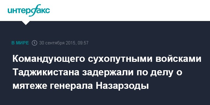 Москва. 30 сентября. INTERFAX.RU - В Таджикистане задержан глава Управления сухопутных войск Минобороны республики полковник Назар Сафаров, сообщил в среду "Интерфаксу" источник в правоохранительных органах республики.