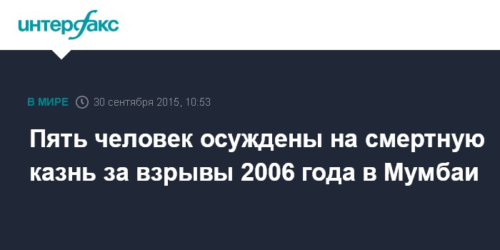 Москва. 30 сентября. INTERFAX.RU - Суд в Индии приговорил к смерти пятерых мужчин за серию взрывов на железнодорожном вокзале в индийском городе Мумбаи в 2006 году, сообщило в среду агентство PTI.