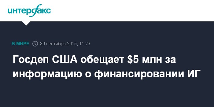 Москва. 30 сентября. INTERFAX.RU - Государственный департамент США пообещал вознаграждение в размере $5 млн за информацию о сделках по продаже нефти и археологических реликвий, участником которых является радикальная группировка "Исламское государство" (ИГ, запрещено в России), сообщает официальный сайт программы "Вознаграждение за помощь правосудию" (Rewards for Justice).