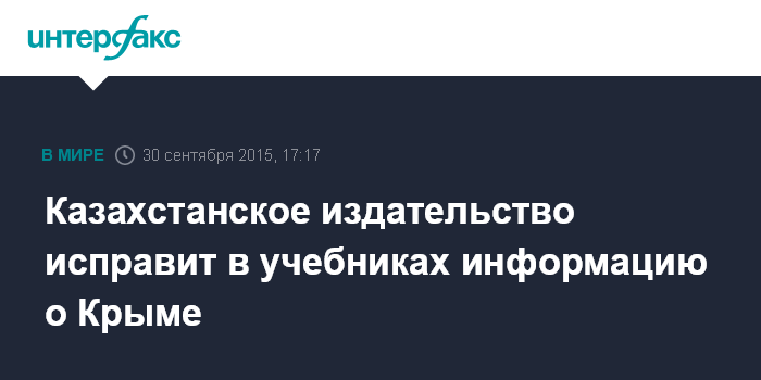 Москва. 30 сентября. INTERFAX.RU - Комитет министерства образования и науки Казахстана поручил исправить информации о Крыме, который указан как субъект РФ, в учебниках издательства "Мектеп".