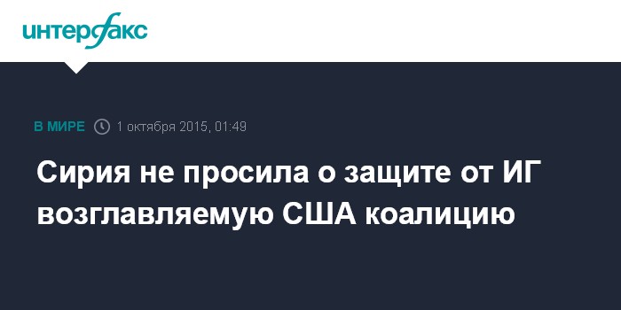 Москва. 1 октября. INTERFAX.RU - Сирия не обращалась с просьбой к возглавляемой США антиигиловской коалиции о защите в соответствии со статьей Устава ООН, в отношении России такая просьба поступила, заявил глава МИД РФ Сергей Лавров.