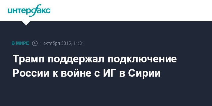 Москва. 1 октября. INTERFAX.RU - Кандидат на пост президента США миллиардер-республиканец Доналд Трамп высказался в поддержку участия российских военных в борьбе против "Исламского государства" (ИГ, запрещено в РФ) в Сирии, сообщают в четверг американские СМИ.