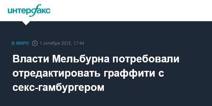 Москва. 1 октября. INTERFAX.RU - Совет Мельбурна постановил отредактировать граффити на одной из городских стен, на котором изображены люди, занимающиеся любовью в огромном гамбургере. Об этом пишет The Guardian.