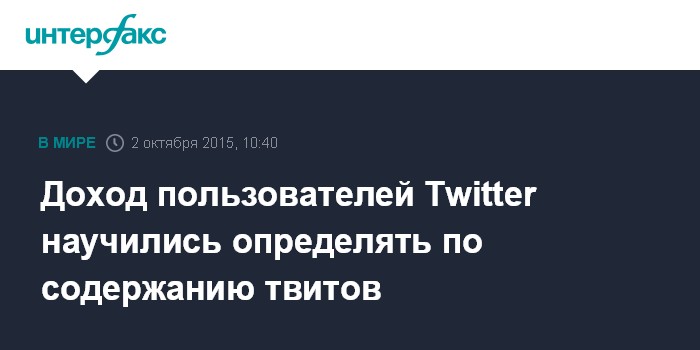 Москва. 2 октября. INTERFAX.RU - Группа психологов и специалистов по информационным технологиям из нескольких американских и английских университетов совместно с Microsoft Research научились предсказывать годовой доход пользователей Twitter в Великобритании по темам твитов, выражаемым в них эмоциям и наиболее часто употребляемым словам, сообщает N+1 со ссылкой на журнал PLoS ONE.