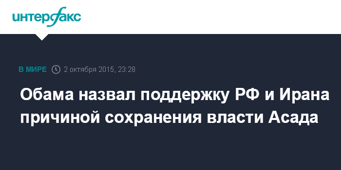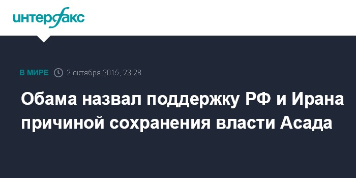 Москва. 2 октября. INTERFAX.RU - Президент Сирии Башар Асад все еще находится у власти, так как пользуется поддержкой Ирана и России, заявил в пятницу президент США Барак Обама.
