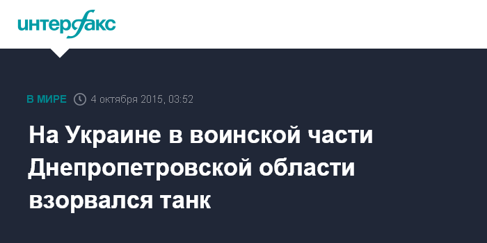 Москва. 4 октября. INTERFAX.RU - На территории воинской части в поселке Черкасское Днепропетровской области Украины взорвался танк 54-й бригады, сообщает сайт hromadske.tv.