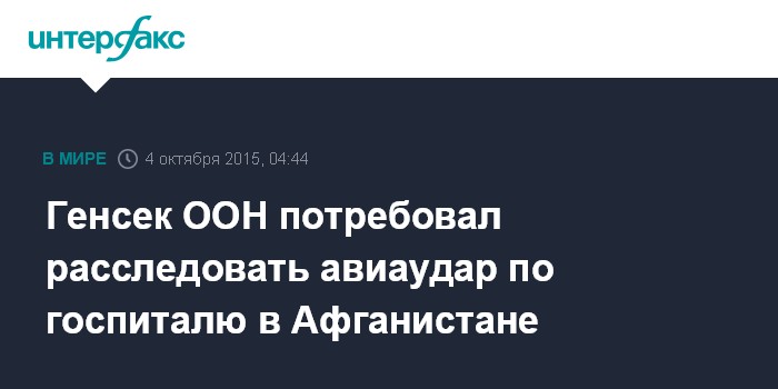 Москва. 4 октября. INTERFAX.RU - Генеральный секретарь ООН Пан Ги Мун осудил и призывал расследовать бомбардировку госпиталя организации "Врачи без границ" в афганском городе Кундуз.