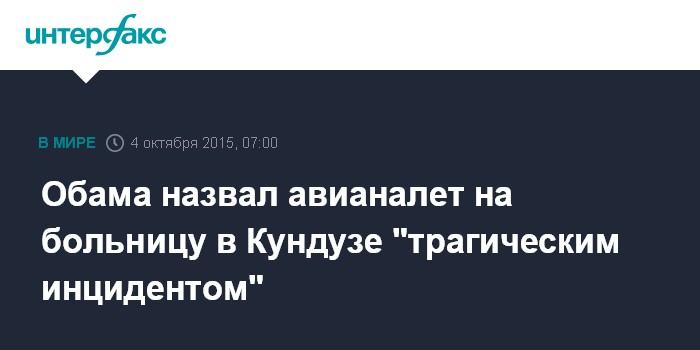 Москва. 4 октября. INTERFAX.RU - Президент США Барак Обама выразил "глубочайшие соболезнования" жертвам авиаудара американской авиации по больнице в афганском городе Кундуз, передает France24.