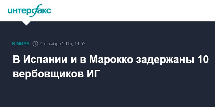 Москва. 4 октября. INTERFAX.RU - Сотрудники правоохранительных органов Испании и Марокко арестовали 10 человек по подозрению в вербовке новых боевиков для террористической группировки "Исламское государство" (организация запрещена в России), сообщает агентство Associated Press со ссылкой на заявление МВД Испании.