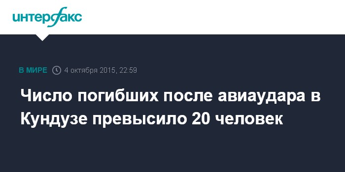 Москва. 4 октября. INTERFAX.RU - В результате авиаудара по больнице в городе Кундуз на севере Афганистана погибли 22 человека, сообщило в воскресенье агентство Associated Press.