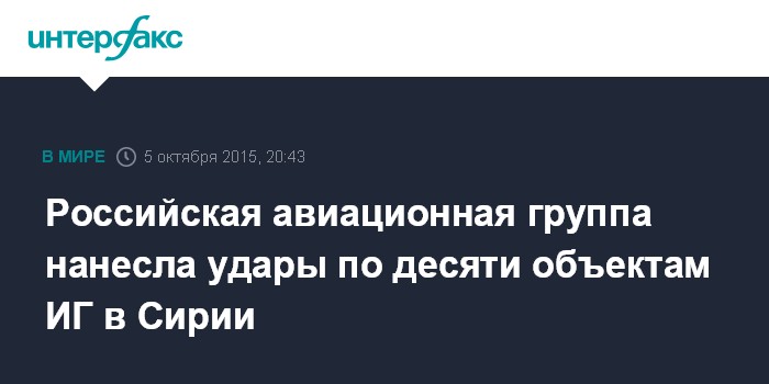 Москва. 5 октября. INTERFAX.RU - Российская авиация днем нанесла точечные удары по десяти объектам "Исламского государства" (организация запрещена в России), заявил официальный представитель Минобороны РФ генерал-майор Игорь Конашенков на брифинге в Москве.