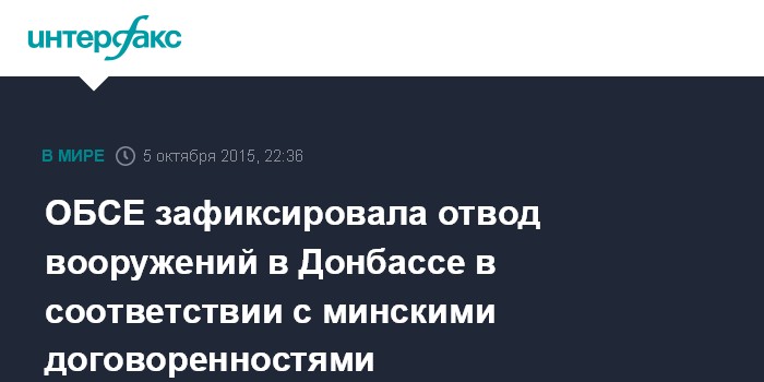 Москва. 5 октября. INTERFAX.RU - Специальная мониторинговая миссия (СММ) ОБСЕ фиксирует процесс отвода вооружений от линии разграничения сторон в Донбассе в соответствии с минскими договоренностями.