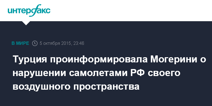"Военный самолет, принадлежащий Российской Федерации, нарушил воздушное пространство Турции в 12:08 3 октября 2015 году к югу от Яйладагы (провинция Хатай). Самолет покинул воздушное пространство Турции в направлении Сирии после того, как на его перехват были направлены два истребителя F-16 турецких ВВС, патрулировавших регион", - говорилось в сообщении на сайте МИД Турции.