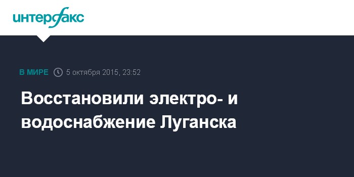 Москва. 5 октября. INTERFAX.RU - Председатель Совета министров самопровозглашенной Луганской народной республики (ЛНР) Геннадий Цыпкалов сообщил, что ремонтные бригады полностью восстановили электро- и водоснабжение Луганска, нарушенное из-за аварии на Счастьинской ТЭС.