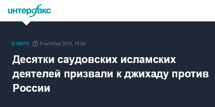 Москва. 6 октября. INTERFAX.RU - Более 50 мусульманских религиозных деятелей Саудовской Аравии призвали исламские страны к войне против России, Ирана, а также правительства Сирии.