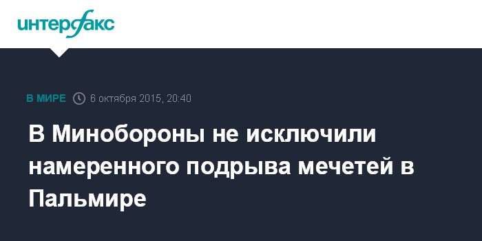 Москва. 6 октября. INTERFAX.RU - Министерство обороны России не исключает подрыв террористами "Исламского государства" (организация запрещена в России - ИФ) мечетей в Пальмире и других сирийских населенных пунктах для фабрикации фальшивых фото- и видеоматериалов с целью обвинений в содеянном российской авиации, заявил официальный представитель ведомства генерал-майор Игорь Конашенков.
