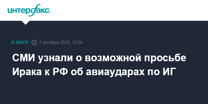 Москва. 7 октября. INTERFAX.RU - Багдад может в ближайшее время запросить у Москвы помощь в нанесении авиаударов по позициям группировки "Исламское государство" (запрещена в России) в Ираке, передает в среду межарабский телеканал "Аль-Арабийя" со ссылкой на иракского парламентария.