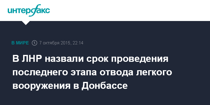 Москва. 7 октября. INTERFAX.RU -Представитель самопровозглашенной Луганской народной республики в рабочей подгруппе по вопросам безопасности Контактной группы по урегулированию конфликта в Донбассе Роман Иванов сообщил, что последний этап отвода вооружений калибром до 100 мм от линии соприкосновения должен завершиться до 8 ноября.